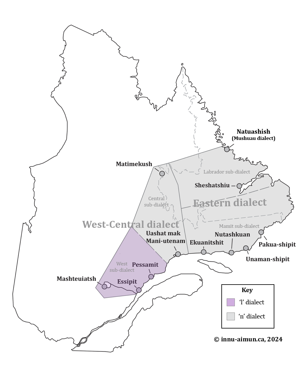 Spoken over a vast territory, Innu consists of two dialect areas: West-Central (Mashteuiatsh, Essipit, Pessamit, Uashat mak Mani-utenam, Matimekush) and East (Ekuanitshit, Nutashkuan, Unaman-shipit, Pakua-shipit, Sheshatshiu, Mushuau (Natuashish)).