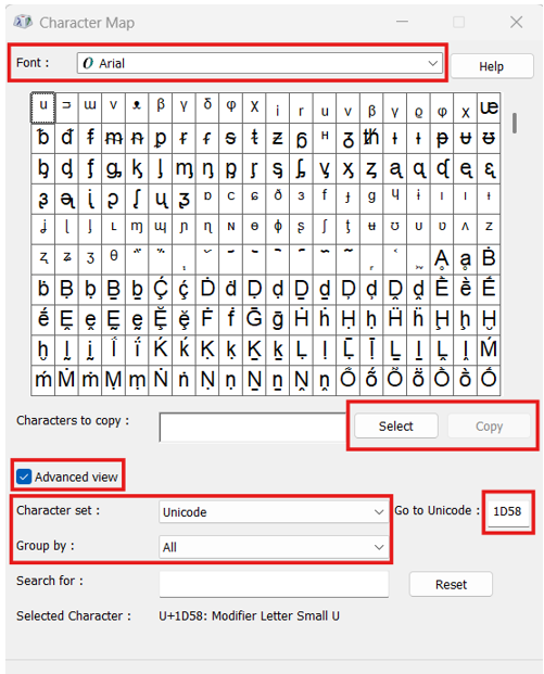 Next in the “Go to Unicode” box, type 1D58. This will bring up the raised ᵘ. From here you can hit “Select” and then you’ll be able to click “Copy” to copy the character to your clipboard.