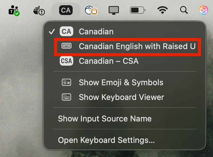 14. Click “CA” or the keyboard icon and then click “Canadian English with Raised U” to select and enable the raised ᵘ keyboard.