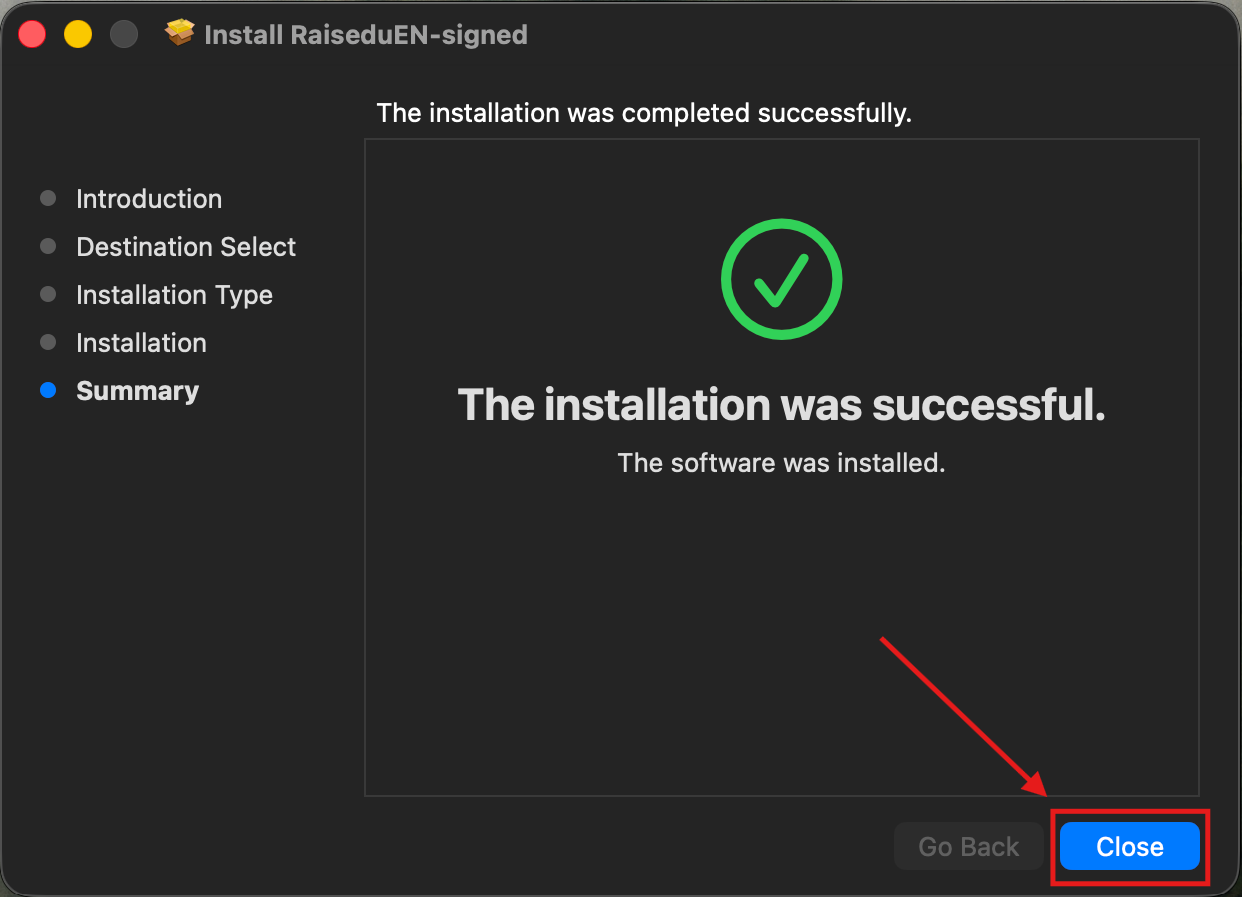 7. After the installation completes, you should see a “The installation was successful” message. Hit “Close”.