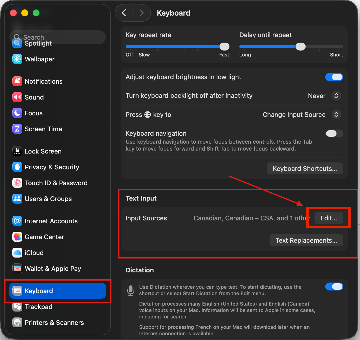 9. After restarting or logging back in, click on the Apple icon on the menu bar in the top left side of your screen. Then go to “System Settings” and then “Keyboard”. You should see a screen that looks something like this for MacOS version 26 and higher. Under “Text Input”, in the “Input Sources” field, click “Edit…
