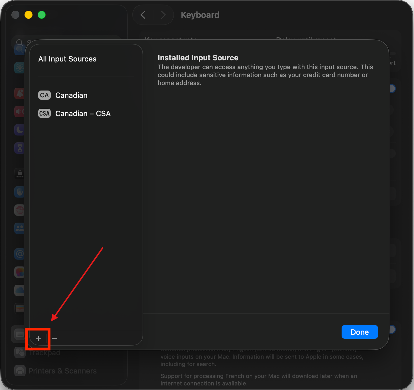 10. You should see your current keyboards in the side panel on the left, click on the add symbol (+) at the bottom of the panel.