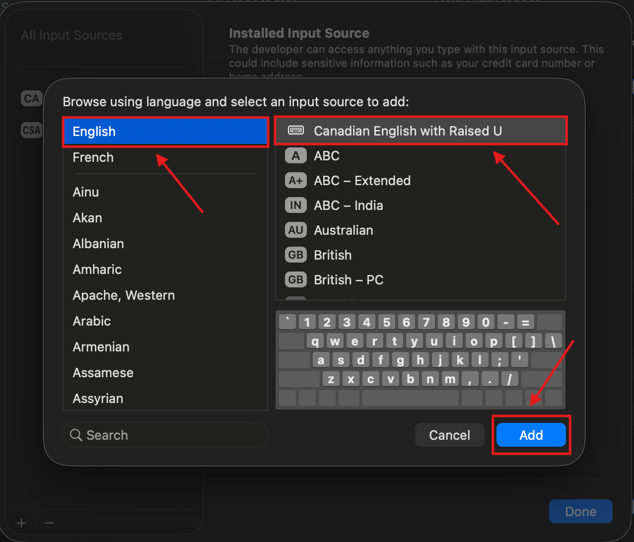 11. In the left side panel, click on English and a series of keyboard options should appear to the right. Click on “Canadian English with Raised U” and then “Add”.
