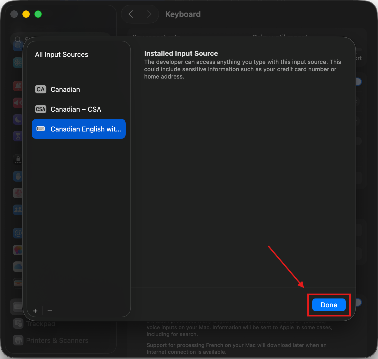 12. After confirming the keyboard has been added to your list of keyboards on the left, click “Done” in the bottom right of the window.
