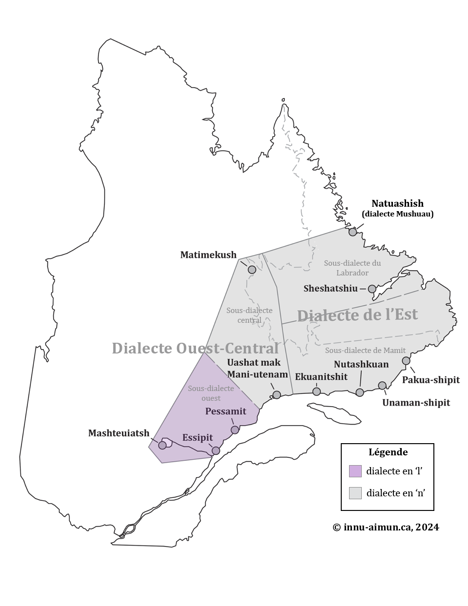 De plus, l’innu dit Ouest-Central est divisé en deux sous-dialectes : Ouest (Mashteuiatsh, Essipit, Pessamit) et Central (Uashat mak Mani-utenam, Matimekush). L’innu de l’Ouest est également appelé dialecte en ‘l’, car le son qui était historiquement /r/ est devenu /l/ dans ce dialecte, alors que dans les autres dialectes (Central et Est), ce son est maintenant prononcé /n/.
