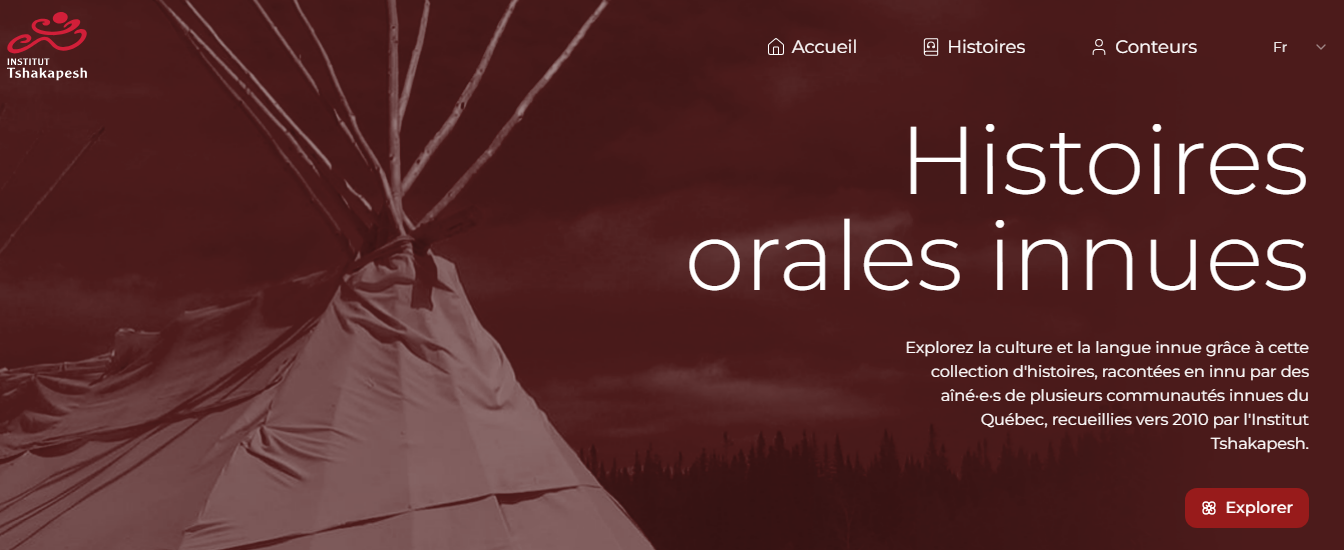 Ces histoires orales innues ont été recueillis à partir de 2010 dans plusieurs communautés innues du Québec par l’Institut Tshakapesh dans le cadre du projet Ressources en ligne pour la langue innue, Université Carleton. Les histoires orales (audio ou vidéo) sont organisées dans une banque de données et peuvent être cherchées par conteur/conteuse, thème, dialecte, et niveau.