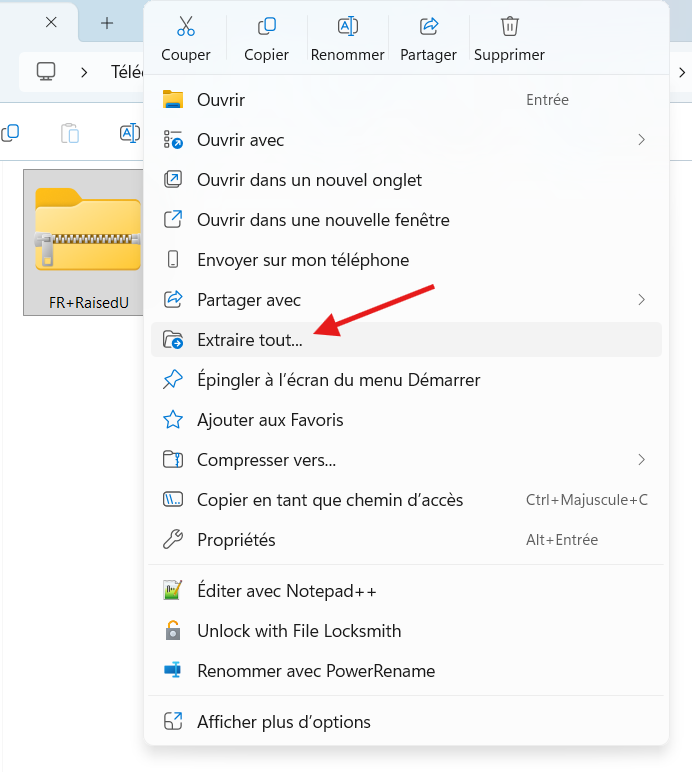 Une fois le fichier téléchargé, localisez le dossier zip et cliquez avec le bouton gauche de la souris pour ouvrir le menu des options, puis cliquez sur « Extraire tout… ».