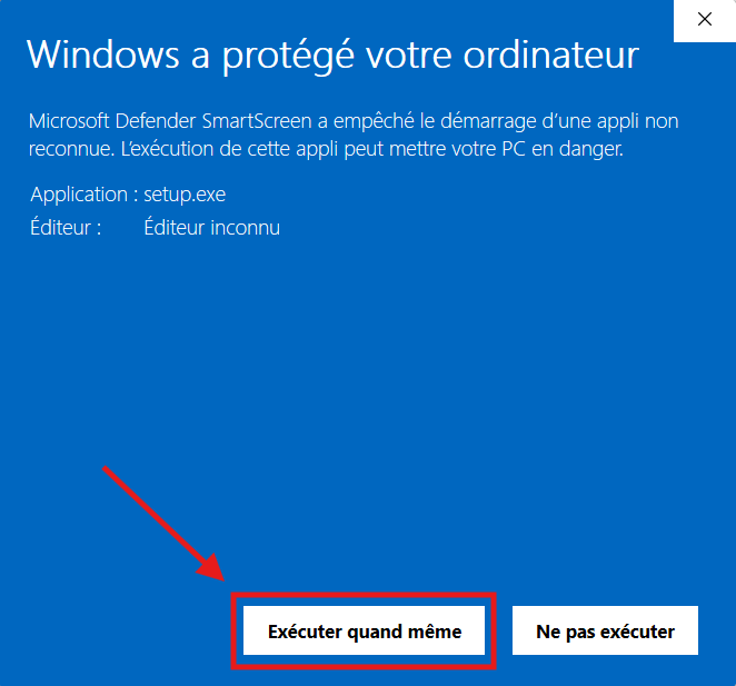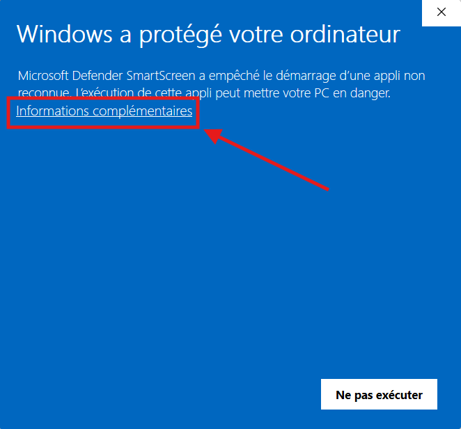 Un autre avertissement s’affichera dans Windows, indiquant qu’il a empêché l’exécution d’une application non reconnue. Pour effacer cette erreur, cliquez sur « Informations complémentaires » sous l’avertissement. Un nouveau bouton « Exécuter quand même » devrait alors apparaître. Cliquez dessus pour lancer l’installation.