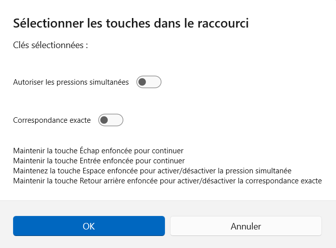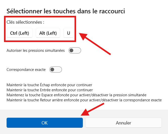 Après avoir vérifié que votre sélection de touches, le ᵘ exposant et « Toutes les applications » sont bien présents, cliquez sur « OK » en haut à droite pour créer votre raccourci.