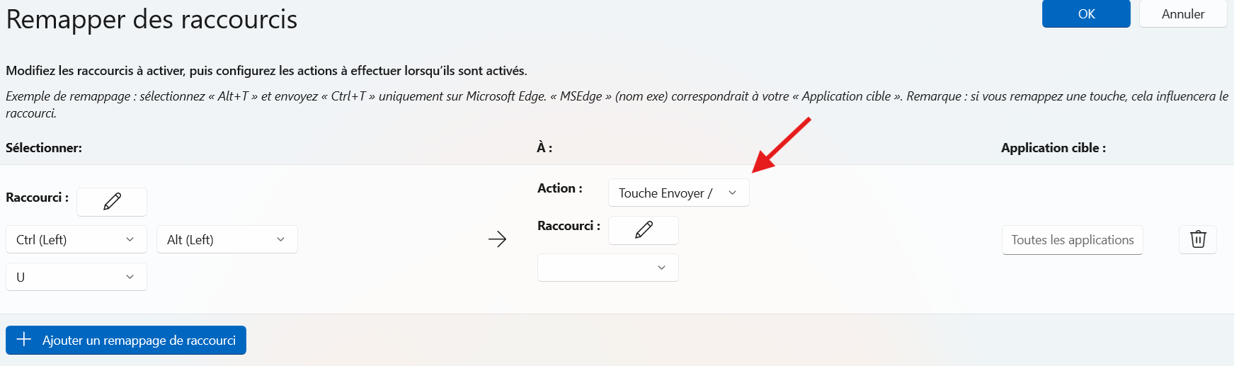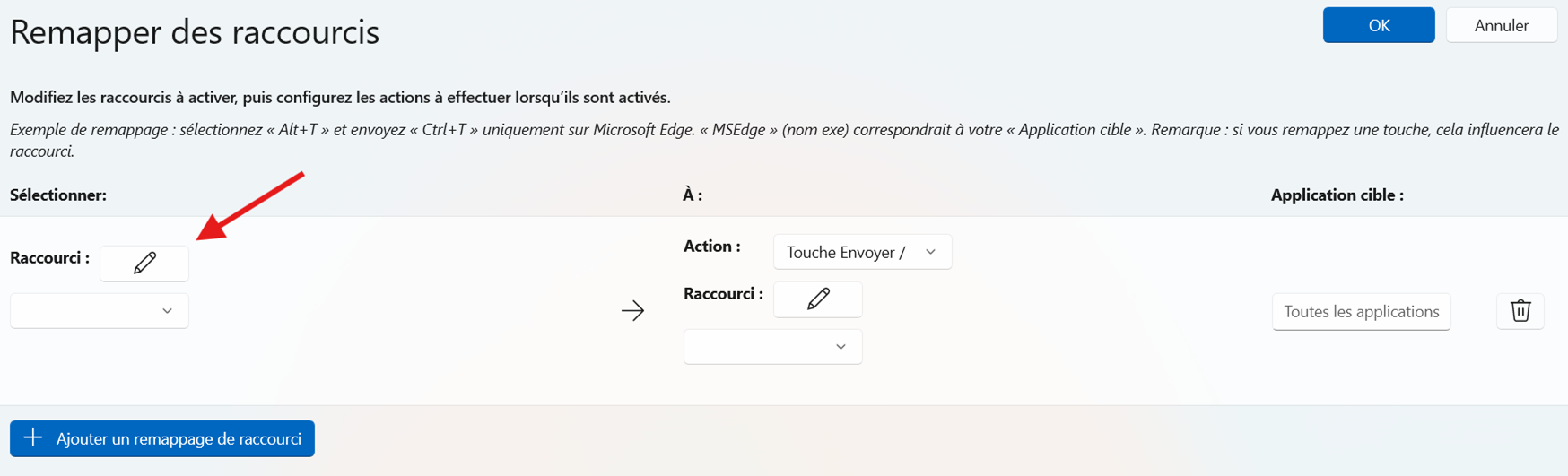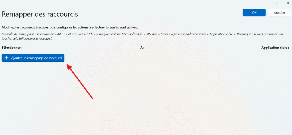 La fenêtre « Remapper des raccourcis » va s’ouvrir. Cliquez sur « Ajouter un remappage de raccourci ».