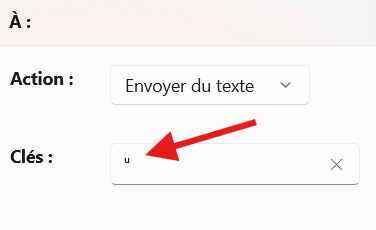 Ensuite, dans la case « Clés », collez le caractère Unicode pour le ᵘ exposant. Vous pouvez le faire en copiant le caractère à partir de la Table des caractères Windows (voir ici pour plus de détails sur comment faire cela), ou en le copiant à partir de cette page web ici : ᵘ