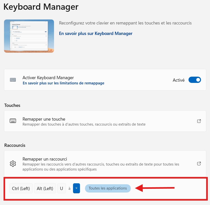 La fenêtre « Remapper les raccourcis » devrait se fermer automatiquement et la fenêtre « Keyboard Manager » qui s’affichait auparavant devrait maintenant afficher votre nouveau raccourci sous « Raccourcis ».