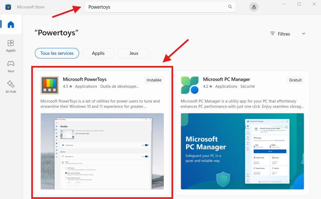 Ou ouvrez le Microsoft Store directement depuis votre menu Démarrer, recherchez « PowerToys » et cliquez sur l’entrée « Microsoft PowerToys ».
