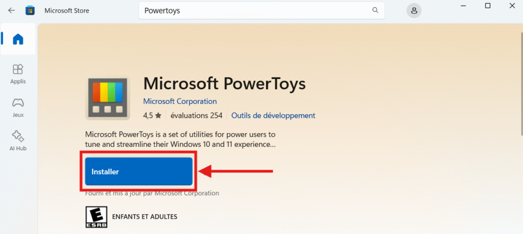 Cela ouvrira l’entrée pour Microsoft Store PowerToys où vous pourrez installer directement PowerToys sans avoir à télécharger et installer un fichier programme. Simplement cliquez sur « Installer » et attendez que l’application finisse de s’installer.