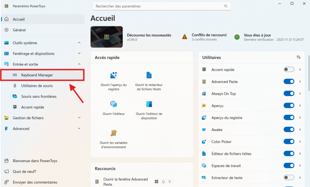 À noter : si l’affichage de PowerToys est différent, vous pouvez essayer de fermer le programme et de le relancer à partir du menu « Démarrer » ou chercher pour voir si vous trouvez l’option « Keyboard Manager » (Gestionnaire de clavier).