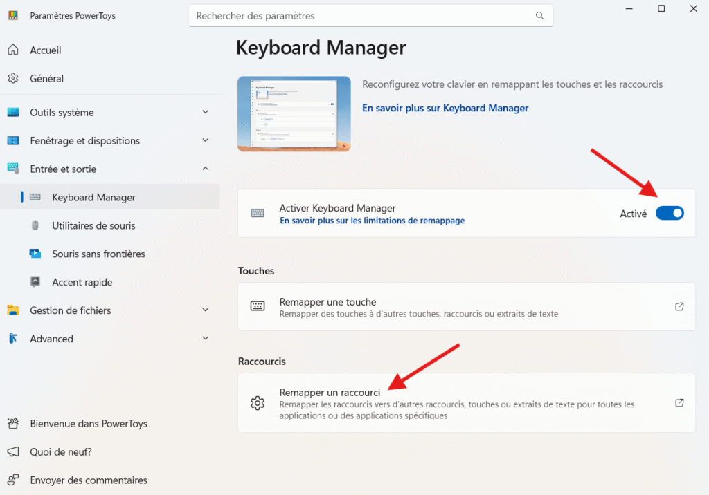 Lorsque vous avez ouvert le « Keyboard Manager » de PowerToys, cliquez pour activer « Activer Keyboard Manager ». Ensuite, sous « Raccourcis », cliquez sur « Remapper un raccourci ».